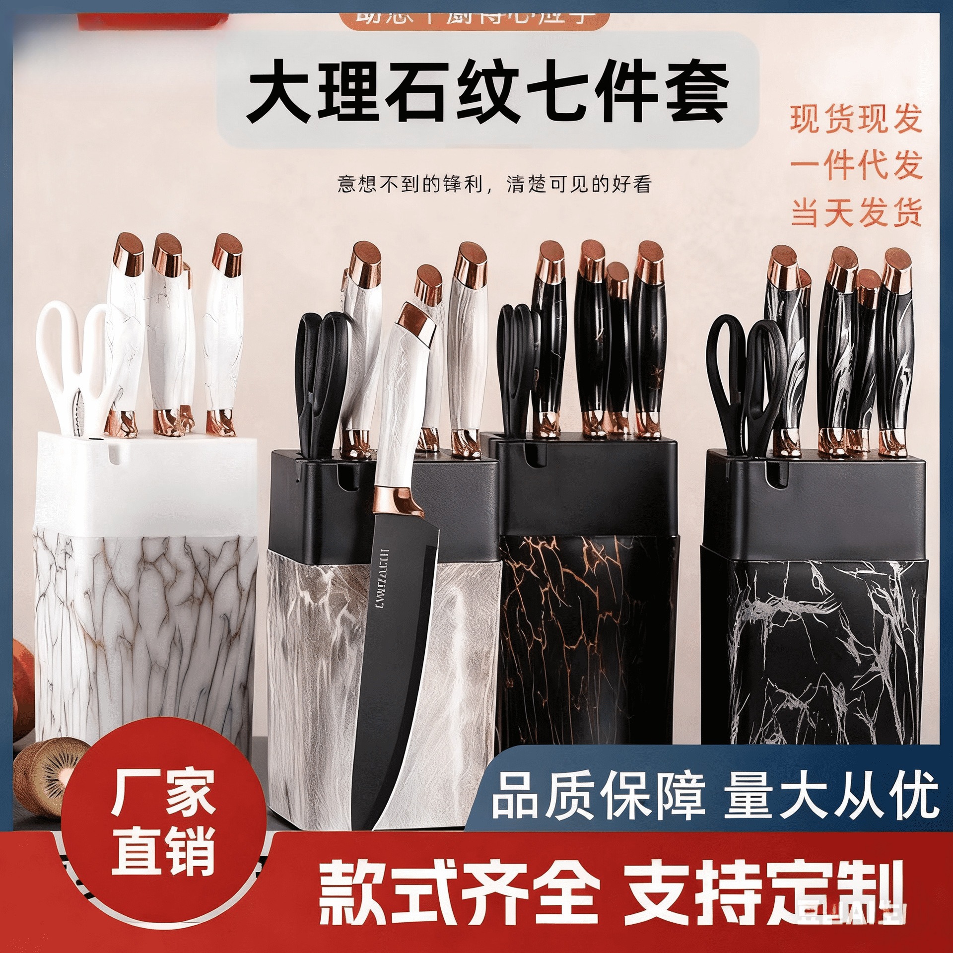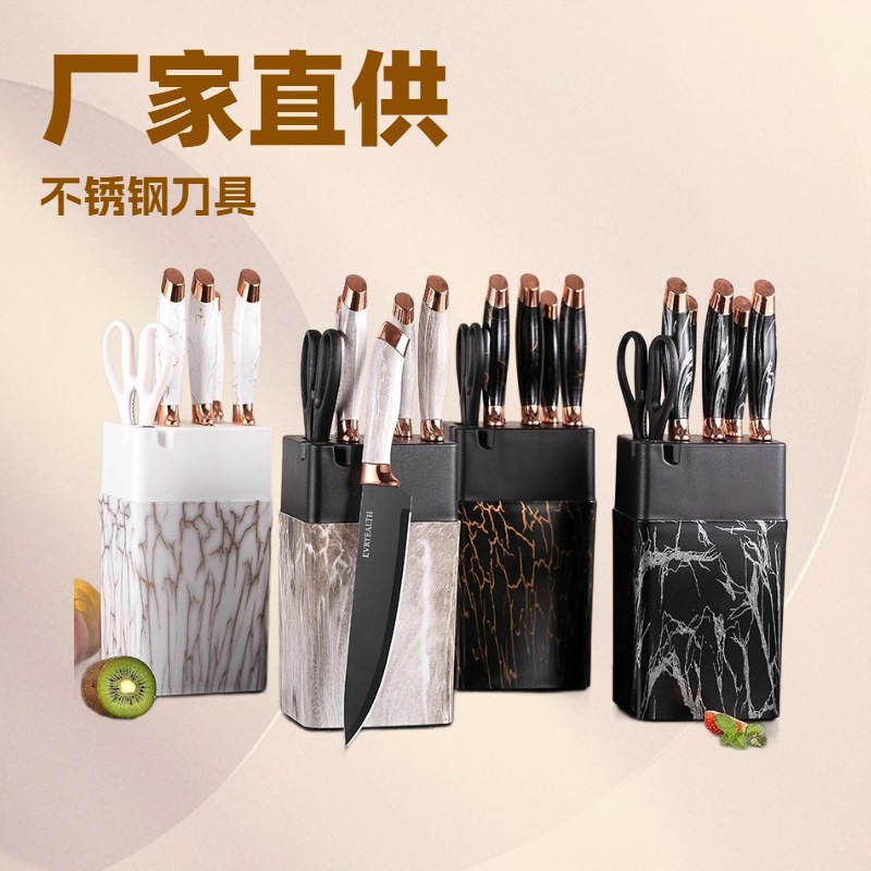 厂家现货厨房家用多功能一体不粘刀具不锈钢带刀座大理石纹七件套