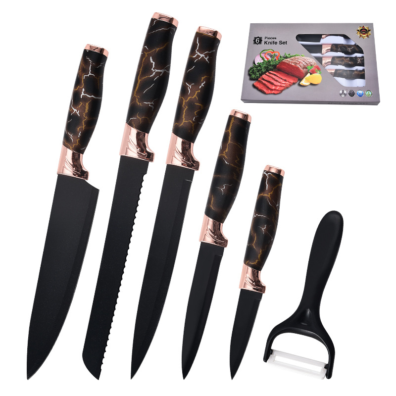 新款黑色刀具套装 玫瑰金电镀头大肚柄六件套不锈钢家用组合套刀