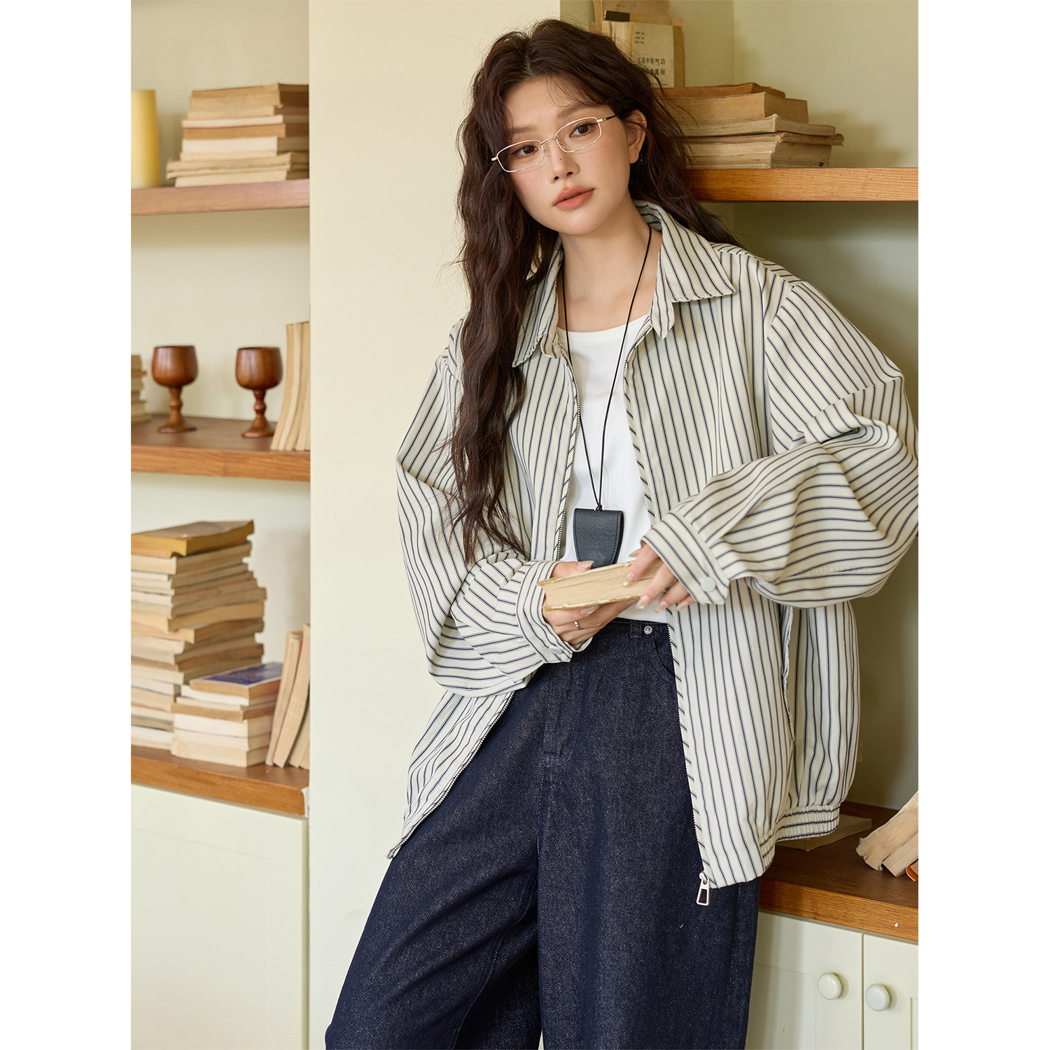 大码女装翻领条纹夹克外套衬衣女纯棉外套设计感小众街头潮流上衣