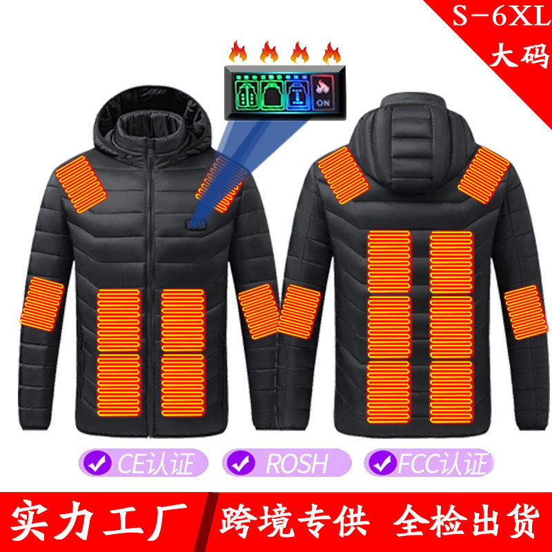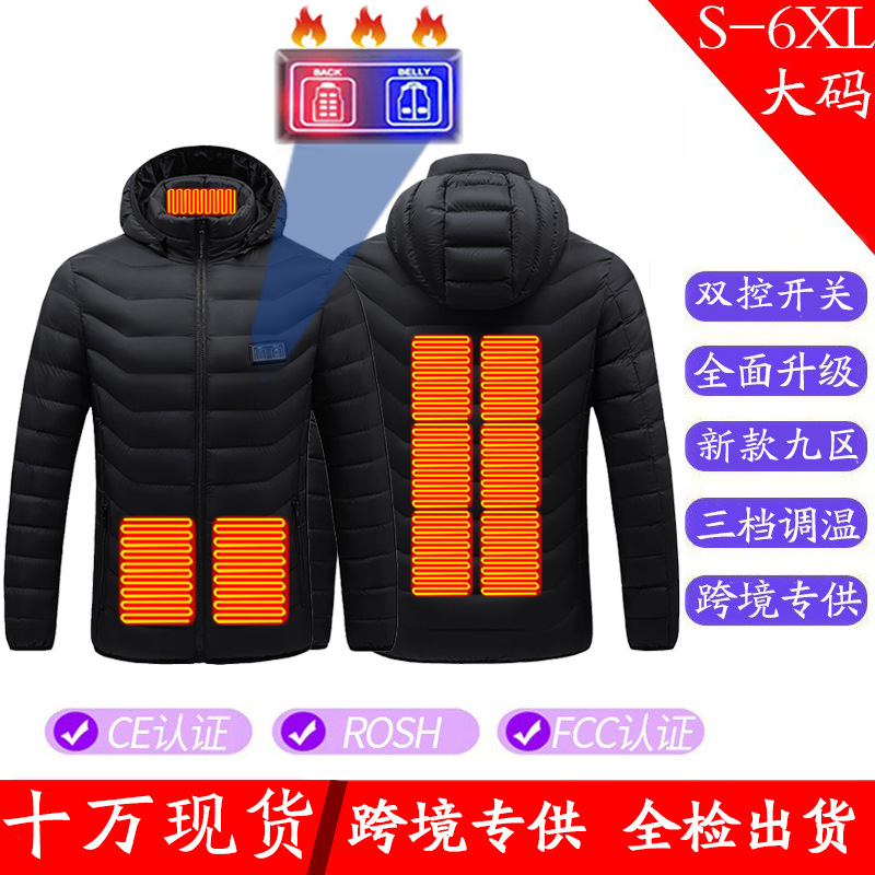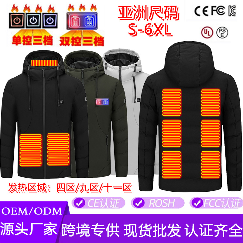 跨境男女九区智能发热棉衣双开四开关连帽加热棉衣电热保暖服外套