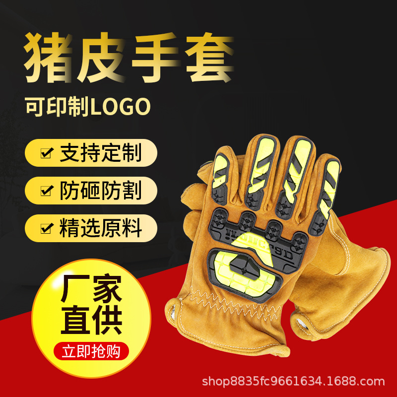 定制工业救援骑行猪皮劳保手套TPR机械防砸防撞防割防滑防刺手套