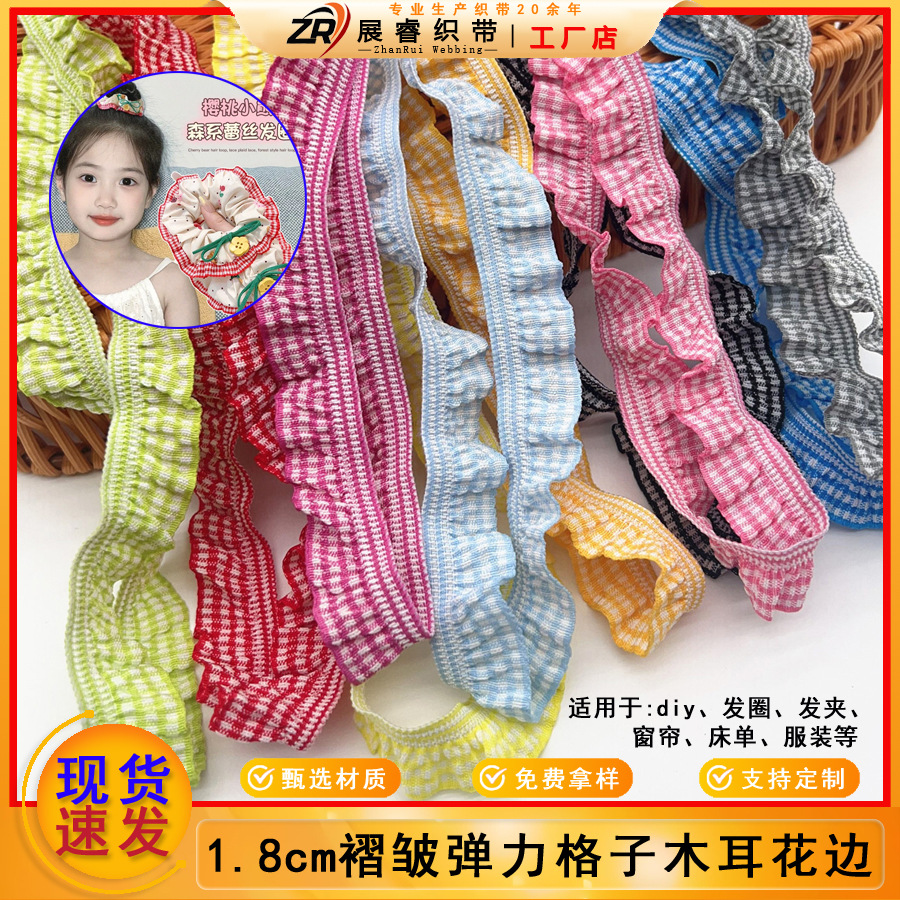 【现货】1.8cm褶皱单边格子彩色木耳花边手工diy发圈娃衣服装辅料