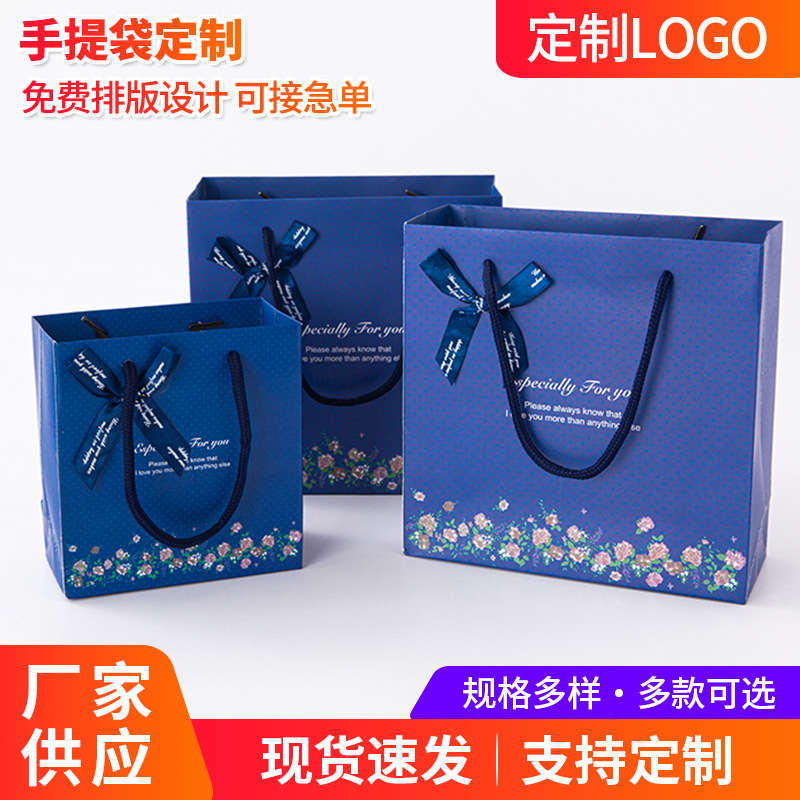 深蓝色白卡纸礼品袋饰品底纸袋手提袋回礼袋蝴蝶结碎花购物袋批发