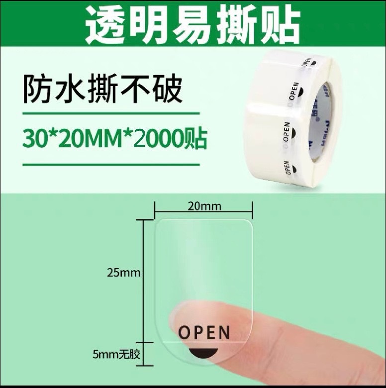 open封口不干胶带易撕口透明封口贴卷装机贴易撕拉可印刷防水标签