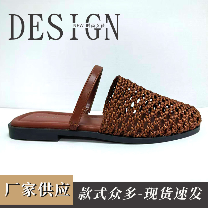 欧美镂空网面包头平底拖鞋女时尚编织款圆头沙滩凉拖鞋厂家供应