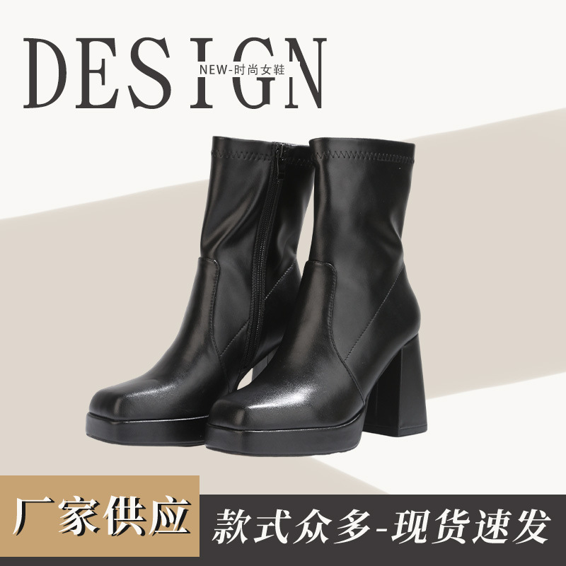 2025年新款黑色方头粗跟超高跟踝靴弹力瘦瘦靴女马丁靴短靴子