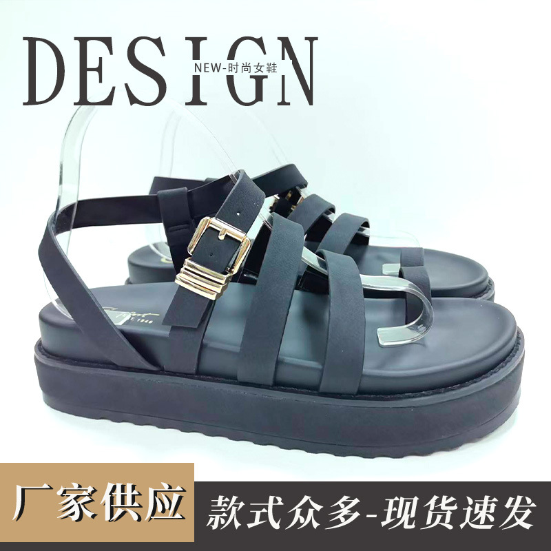 厚底凉拖鞋女时尚简约黑色一字带凉鞋鞋懒人外穿防滑时尚方扣凉鞋