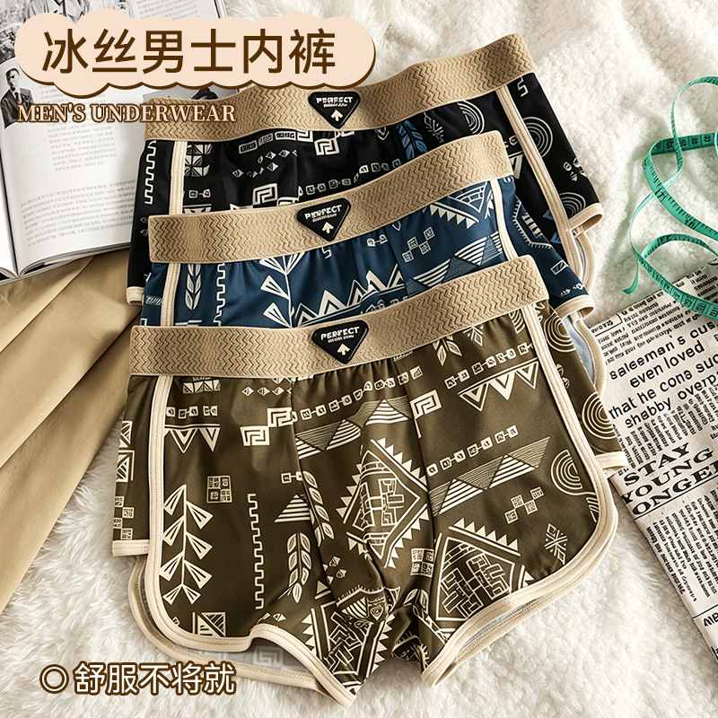 工厂现货男士内裤美式复古冰丝透气平角内裤个性潮流印花四角裤衩
