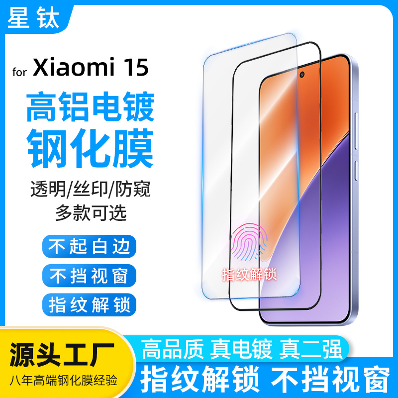 适用小米15钢化膜高铝电镀指纹解锁无孔膜无白边14高清小米钢化膜