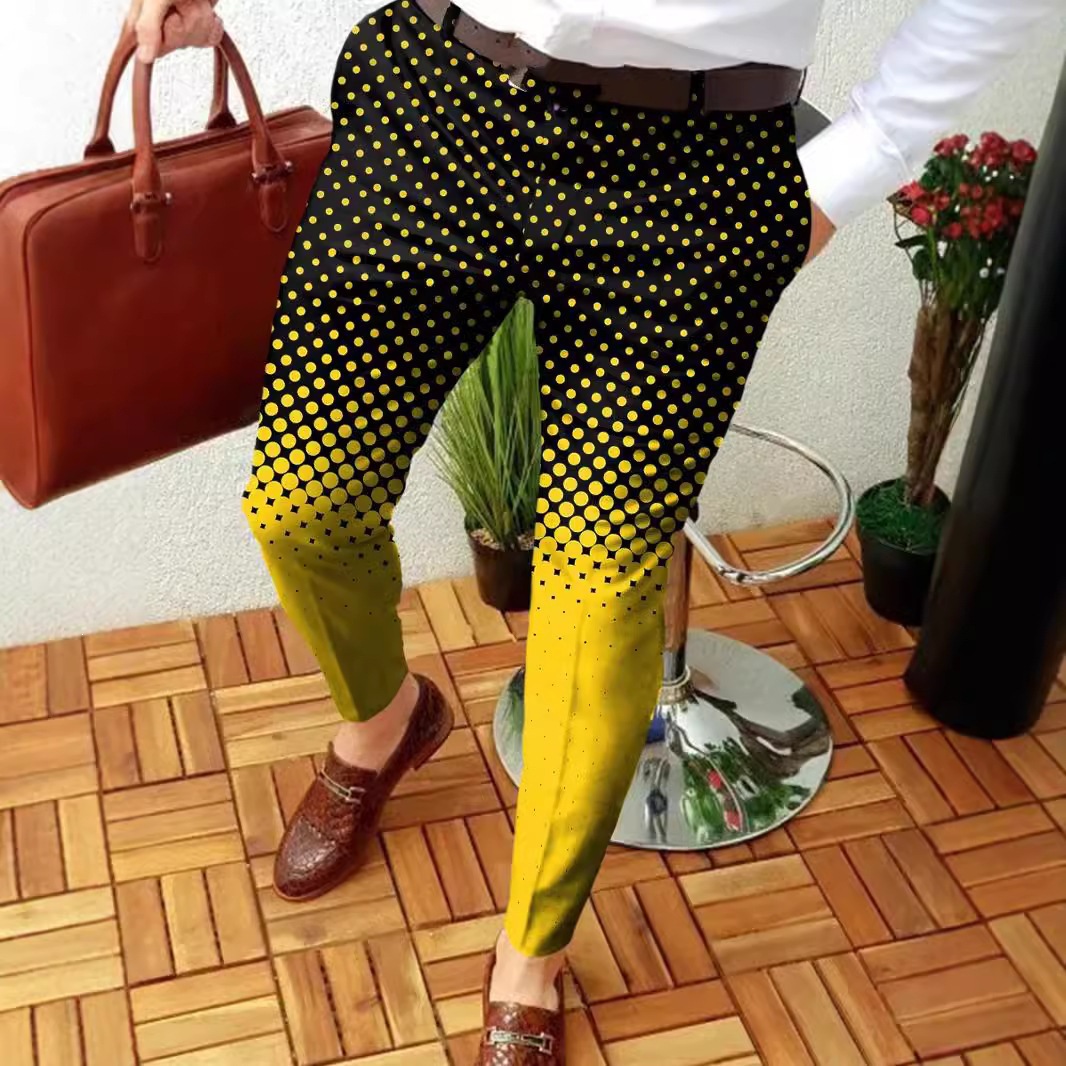 欧美风渐变波点仿牛仔裤男士黑黄撞色修身时尚休闲百搭九分裤批发