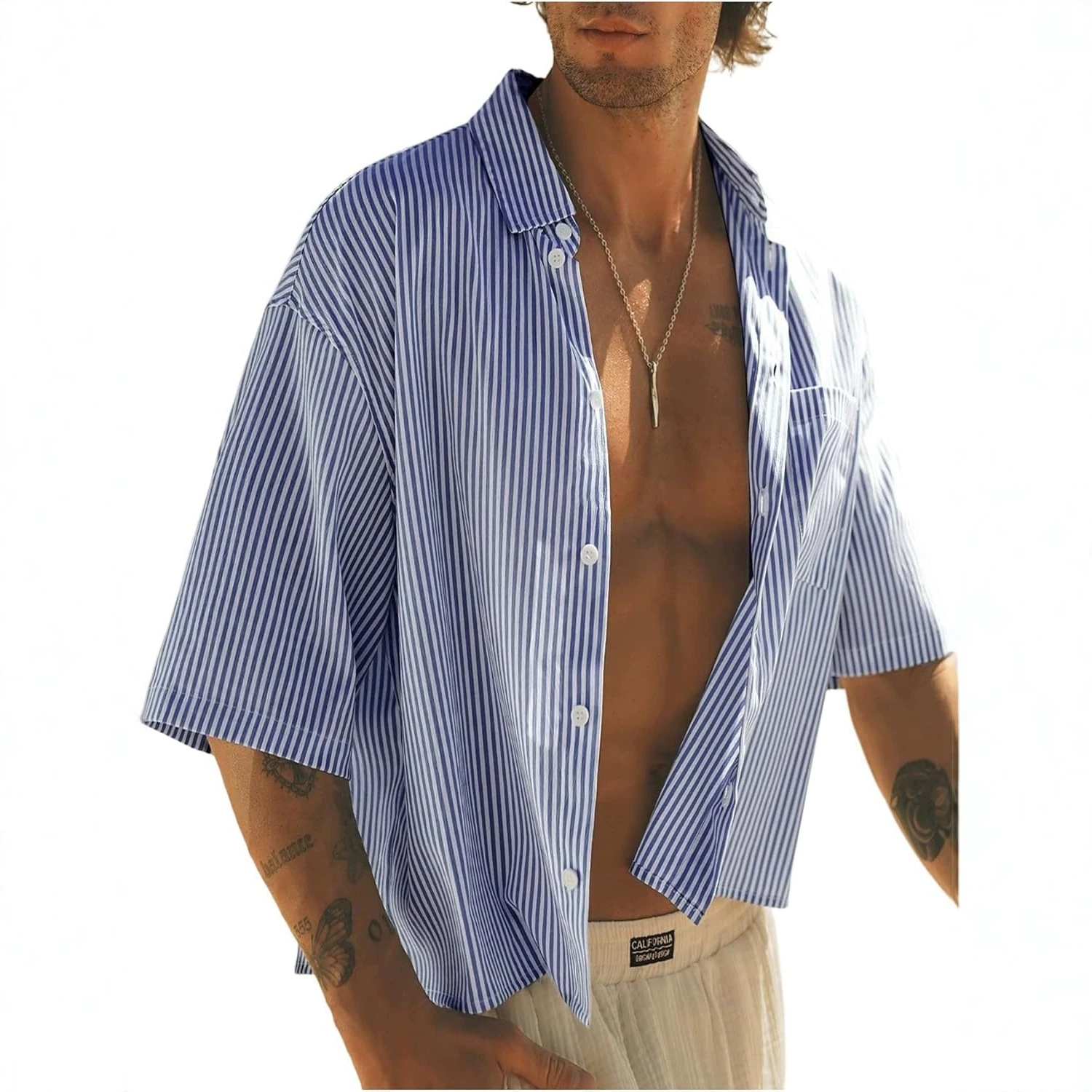 跨境美式爆款男式条纹短款衬衫系扣 Y2k时尚休闲百搭短袖宽松上衣
