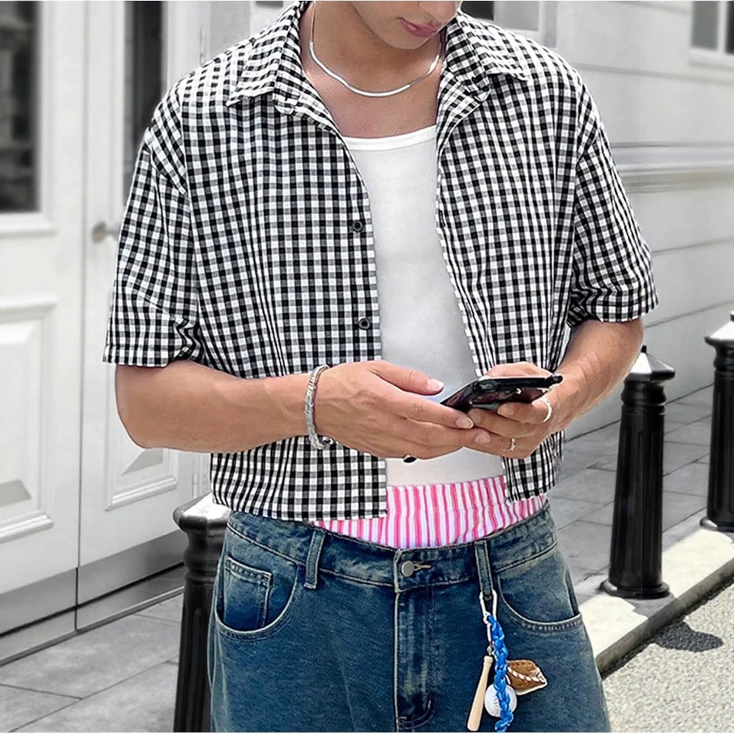 美式复古短款黑白格纹短袖衬衫男夏季辣弟风宽松小众设计感3D衬衣