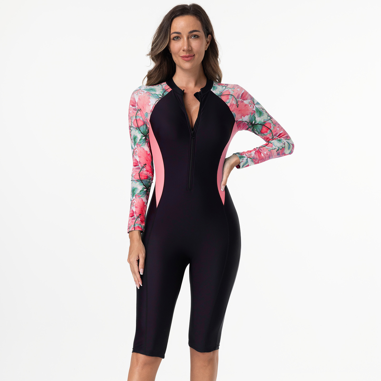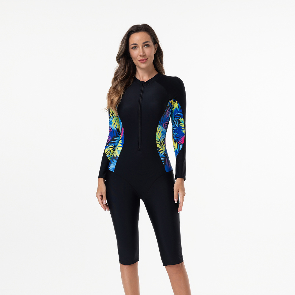 欧美运动套装印花拼接长袖防晒拉链抽绳短裤冲浪服女士分体游泳衣