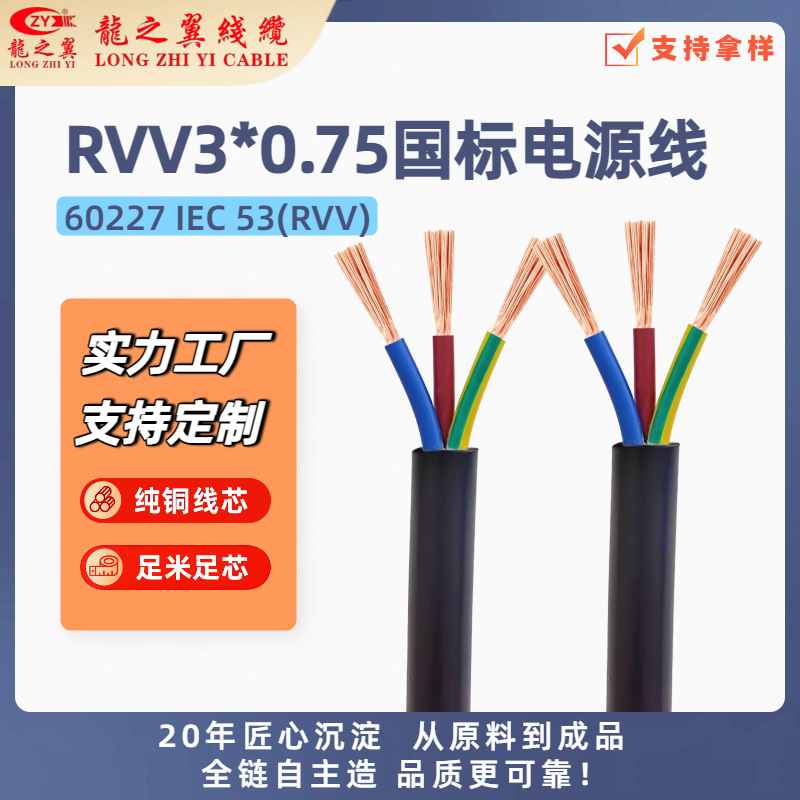 龙之翼 RVV3*0.75平方国标电源线3芯护套线无氧铜家电插头连接线