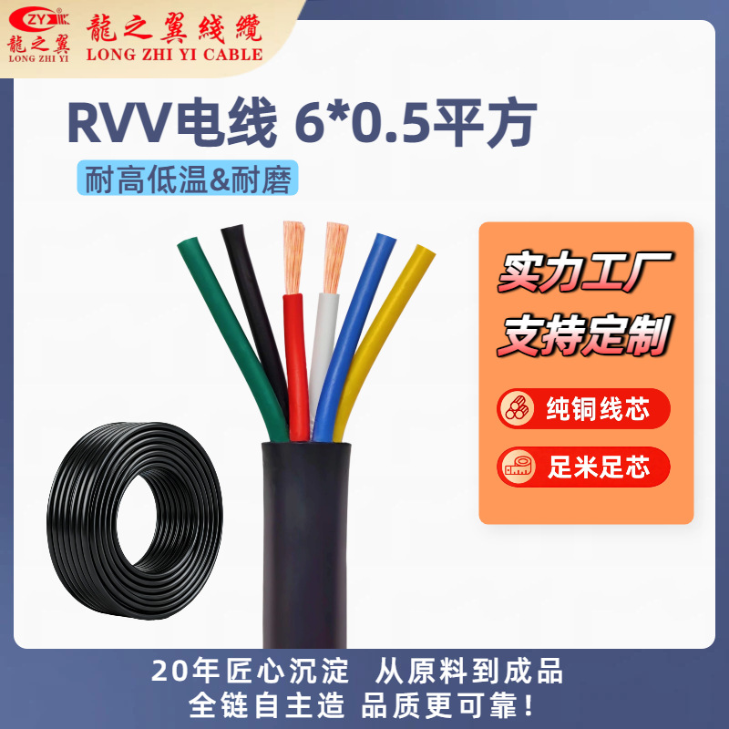 龙之翼RVV电线6芯0点5平方控制线6*0.5铜芯阻燃绝缘护套软电缆线