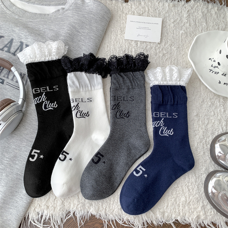 洛丽塔学院风蕾丝花边袜子秋季女中筒袜字母时尚少女ins潮堆堆袜
