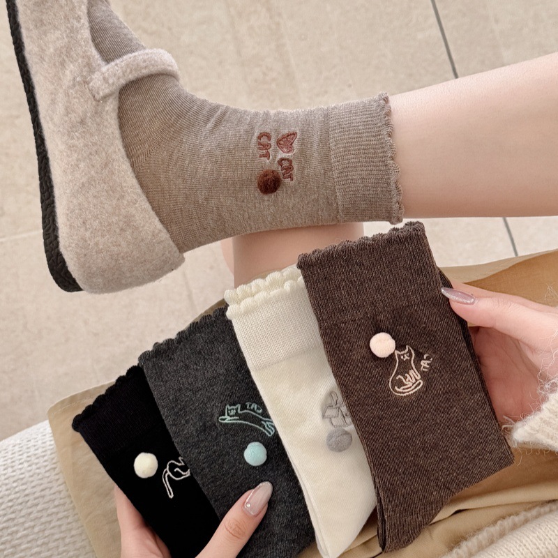 卡通猫咪刺绣中筒袜女立体毛球可爱花边堆堆袜日系风百搭少女棉袜