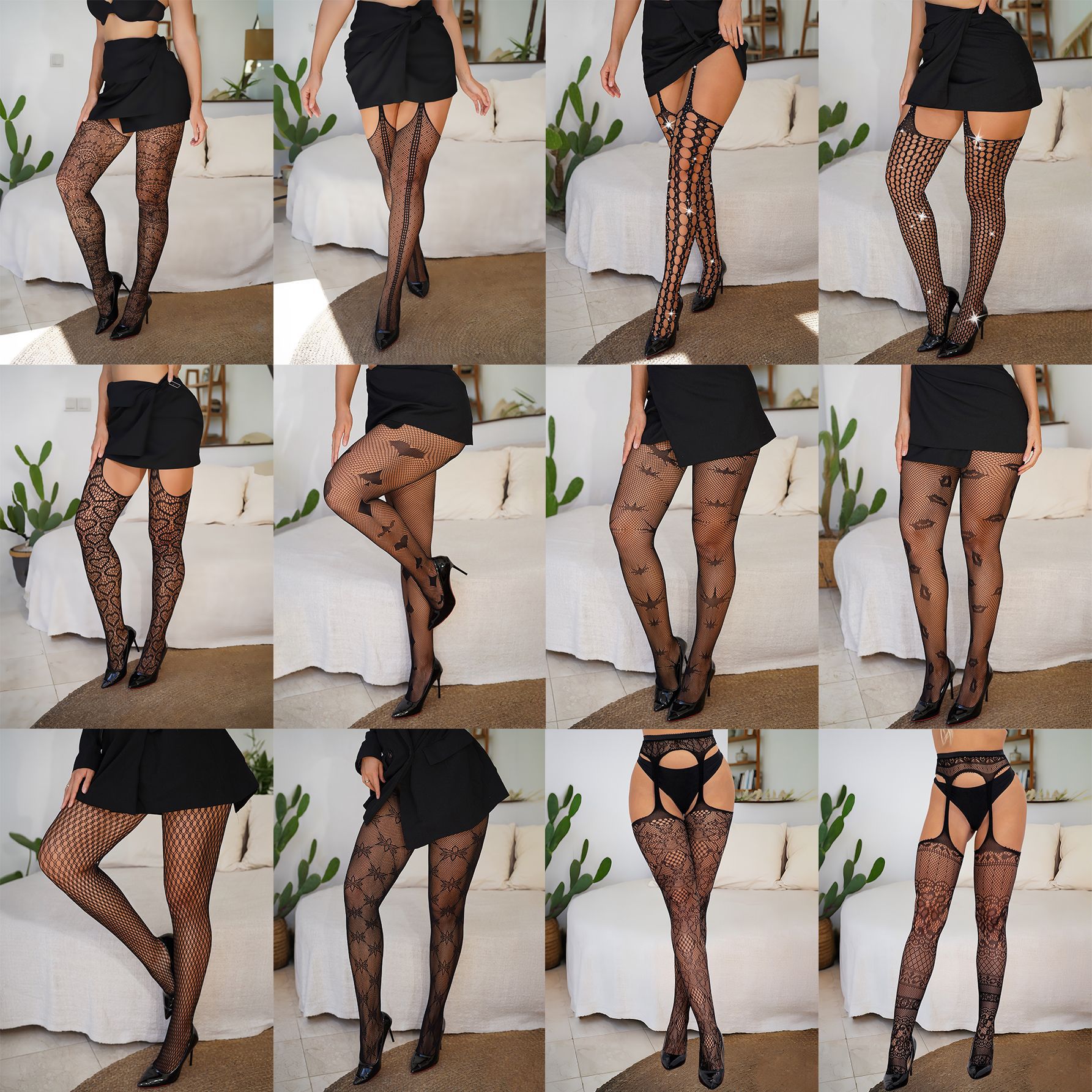 12款混批黑色提花渔网袜女 性感镂空长筒过膝袜 欧美风蕾丝吊带袜