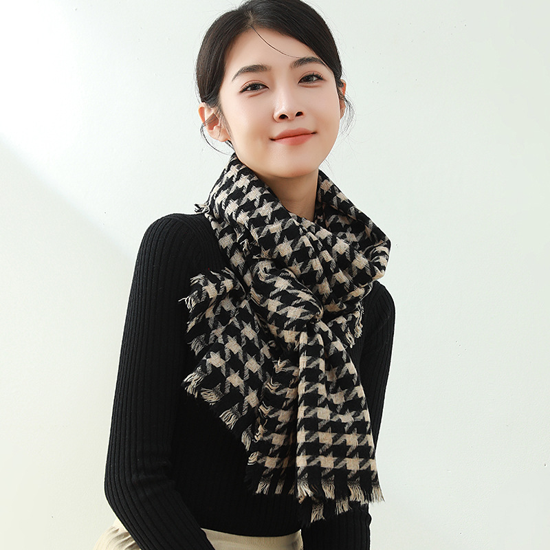 秋冬韩版百搭加厚保暖纯羊毛围脖女冬季防寒千鸟格围巾厂家御寒