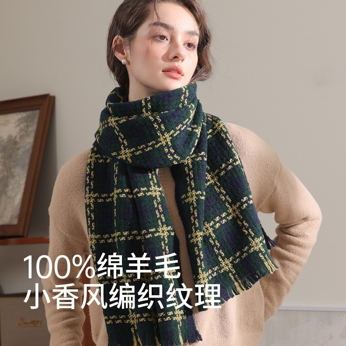 纯羊毛复古编织格秋冬季全羊毛女士围巾格子须小香风百搭保暖流苏