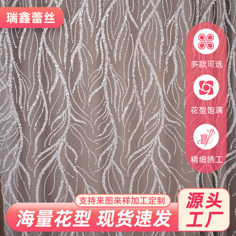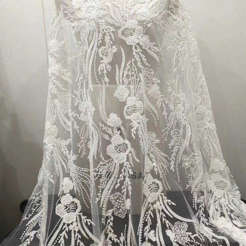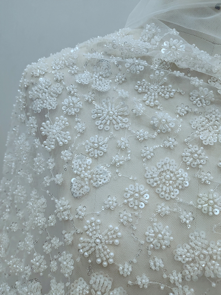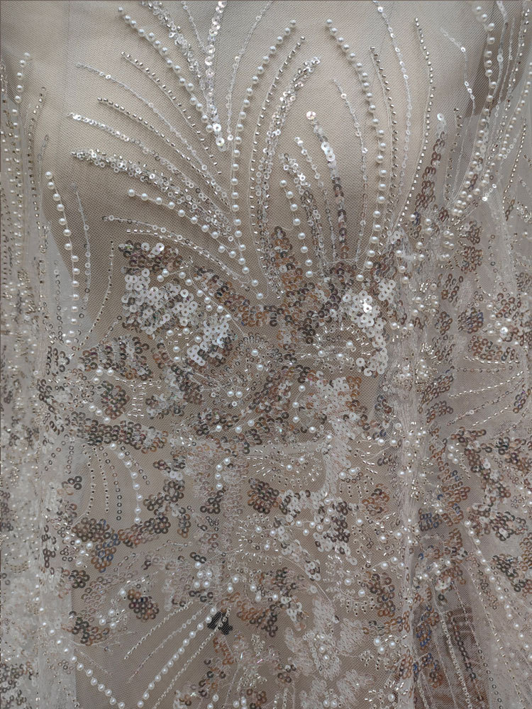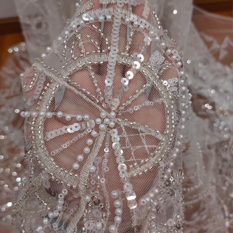 刺绣蕾丝面料厂家新款婚纱礼服演出服装辅料珍珠亮片刺绣蕾丝面料