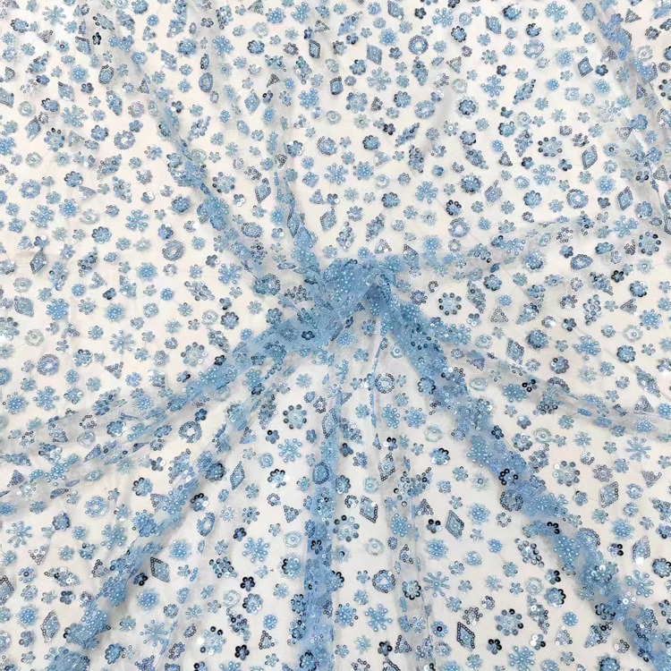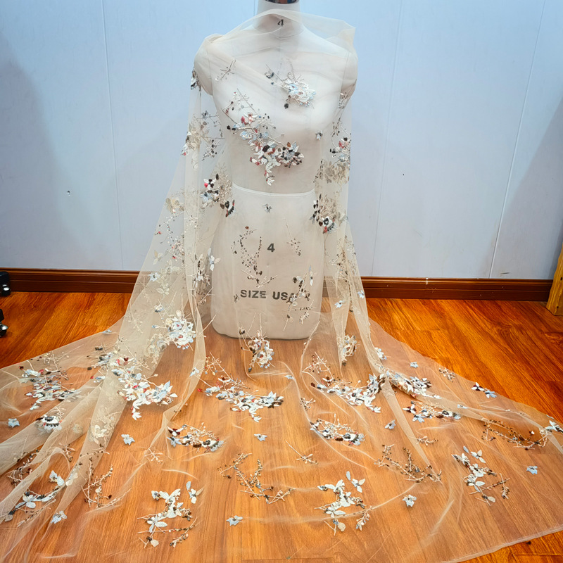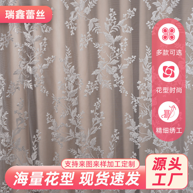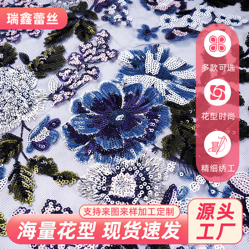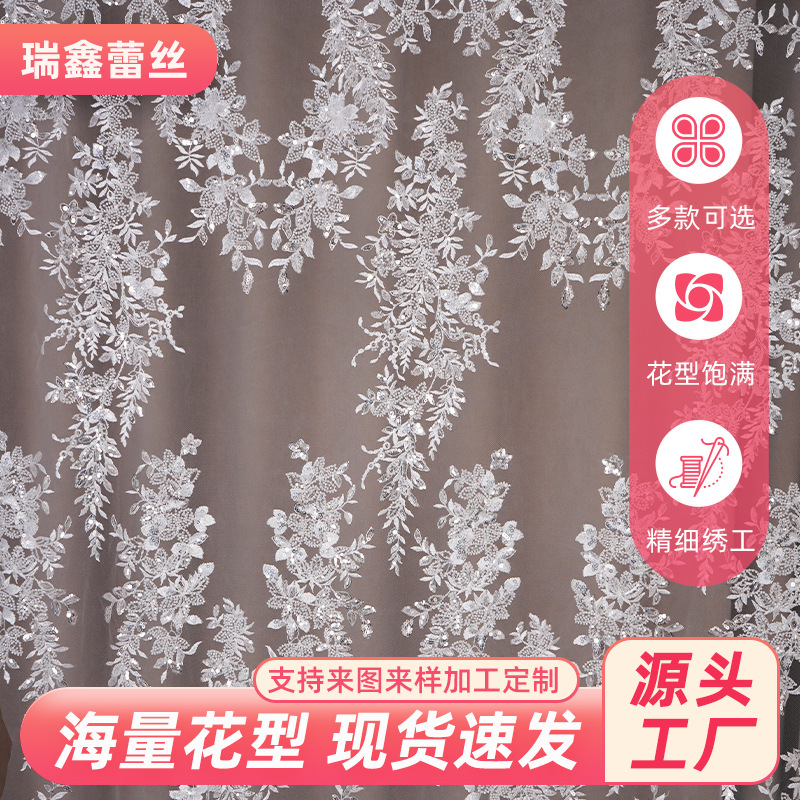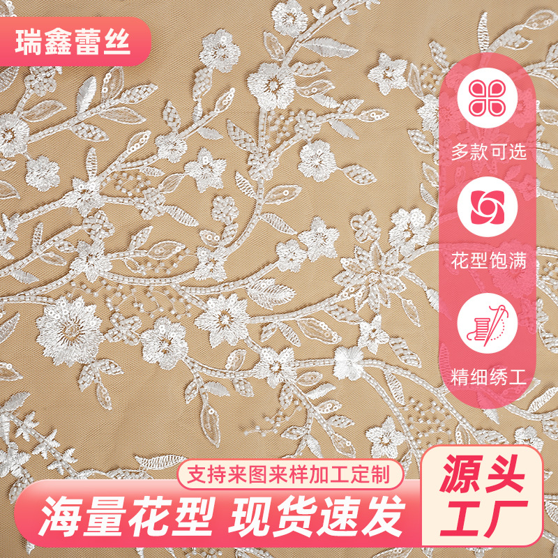 工厂直销高品质花朵刺绣亮片钉珠蕾丝网纱面料婚纱晚礼服服装辅料