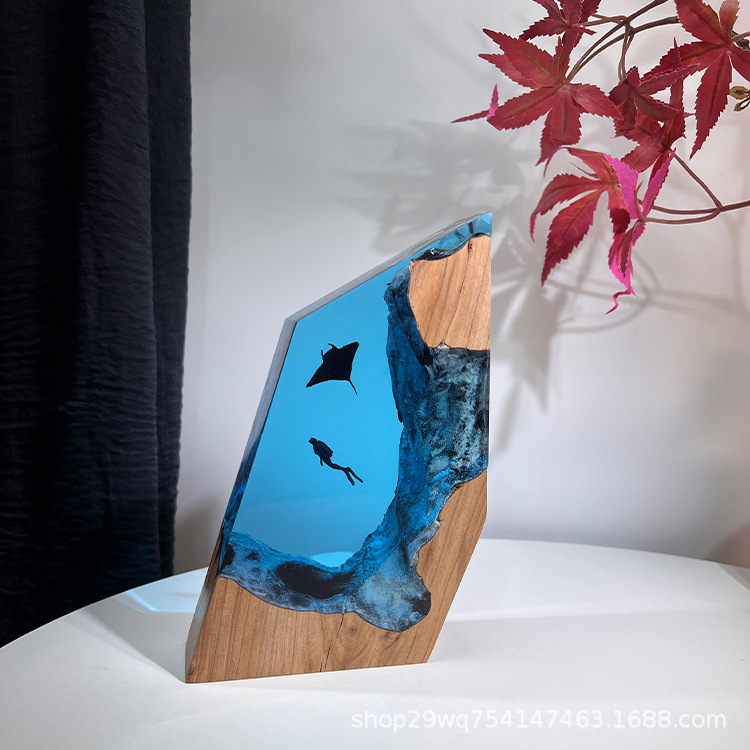 潜水员摆件溶洞鲸鱼桌面海洋树脂灯艺术工艺品实木生日礼物饰品