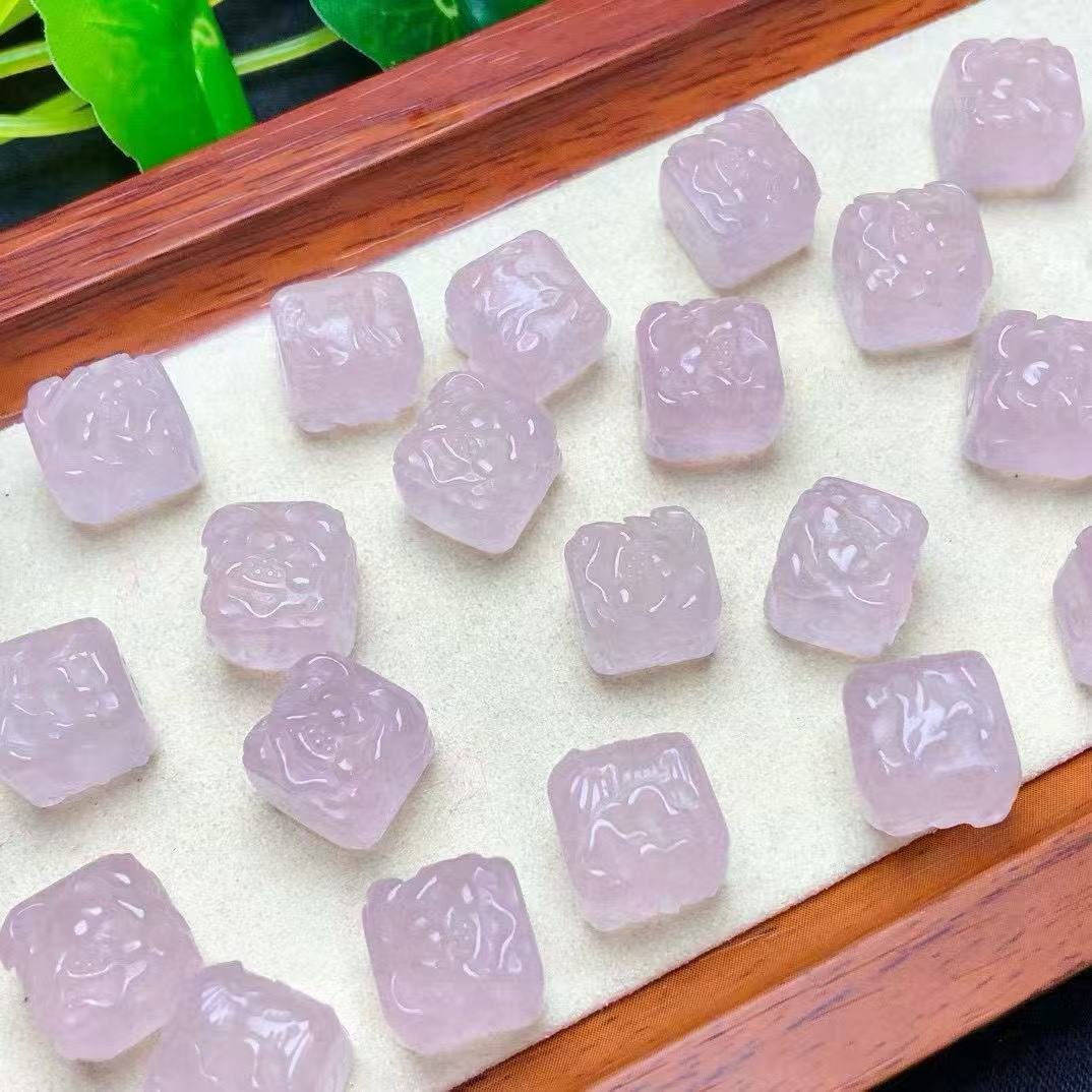 天然粉晶凤穿牡丹手工雕刻项链手链DIY方糖带通孔直播货源批发