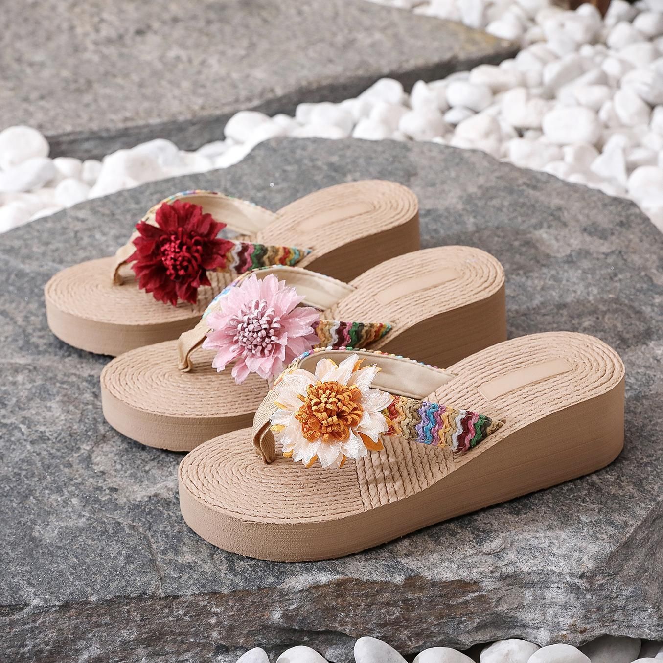 民族风波西米亚女式人字拖2026新款增高花朵坡路夹脚沙滩凉拖鞋女