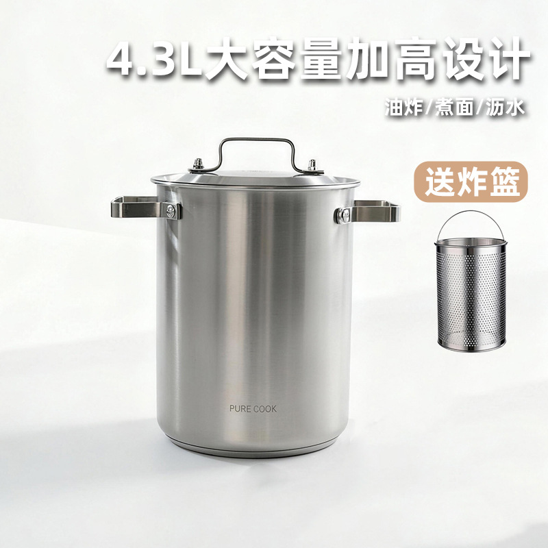 4.3L大容量三层复合底不锈钢油炸锅配炸篮意面锅家用多功能深炸锅