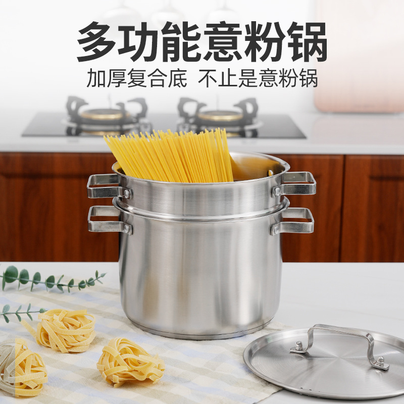 外贸不锈钢意面锅煮面锅带盖厨房加厚复底汤锅带蒸笼跨境爆款炊具