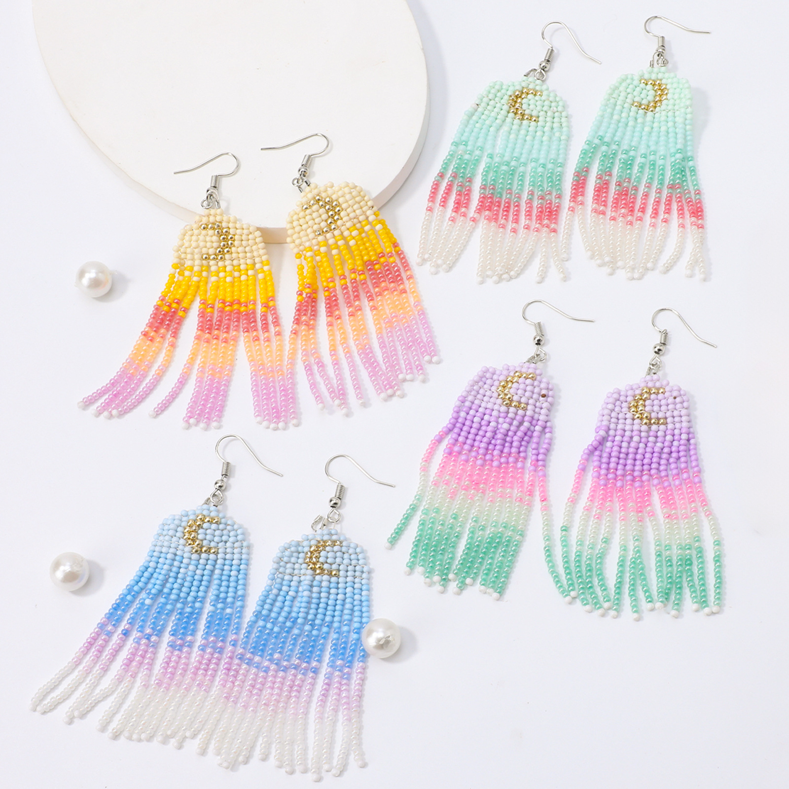 欧美多彩渐变色串珠流苏女士耳环复古小众民族风手工编制耳饰批发