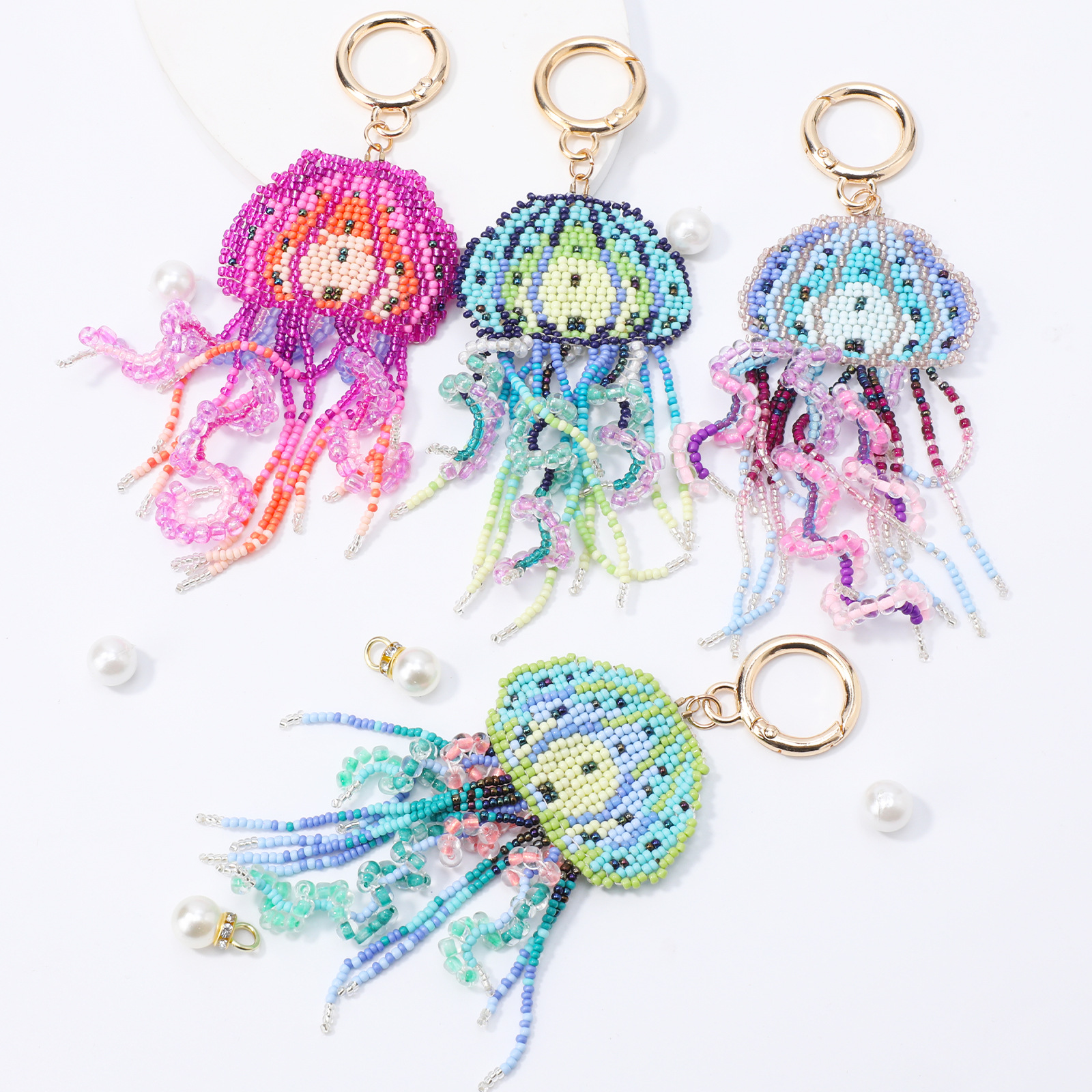 欧美跨境民族风水母流苏米珠编织波西米亚钥匙扣包包挂件手工串珠