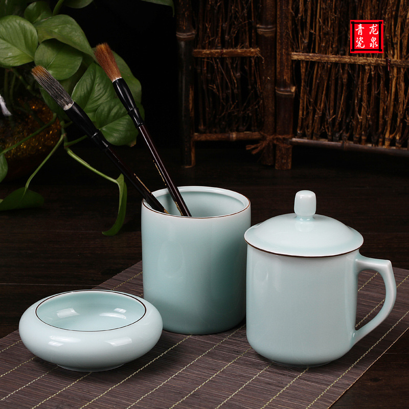 创意中式陶瓷带盖办公泡茶杯龙泉青瓷茶杯笔筒笔洗三件套现货茶器