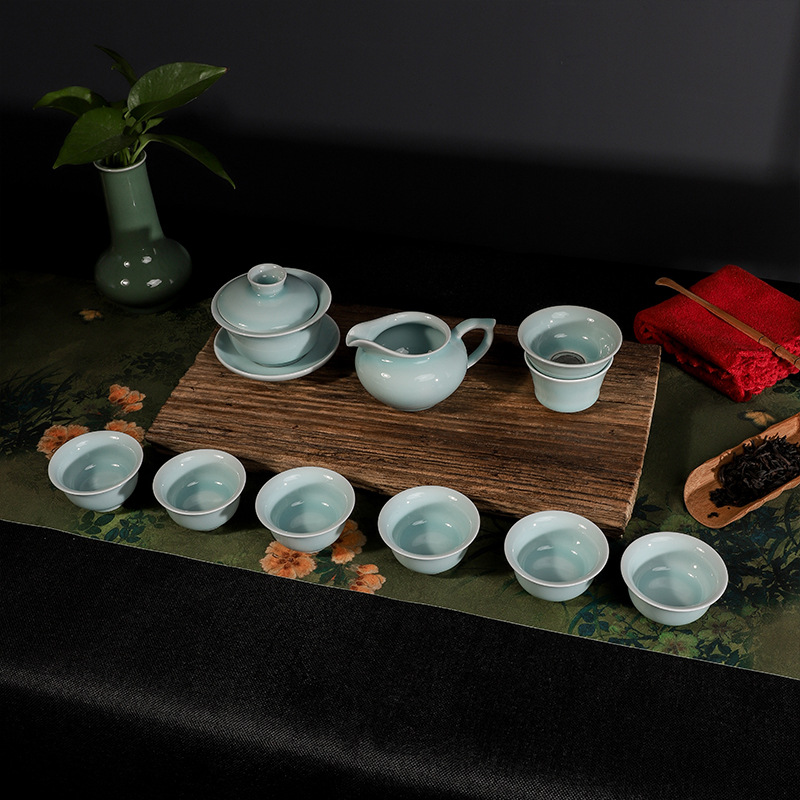 青瓷功夫茶具套装陶瓷盖碗泡茶壶茶杯洗茶道干泡盘整套轻奢复古