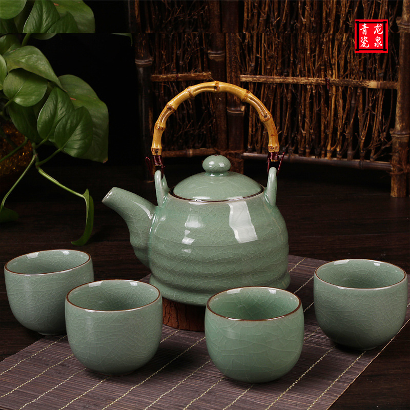 龙泉青瓷哥窑弟窑5头鼓型提梁壶凉茶壶功夫茶具陶瓷器礼品套装