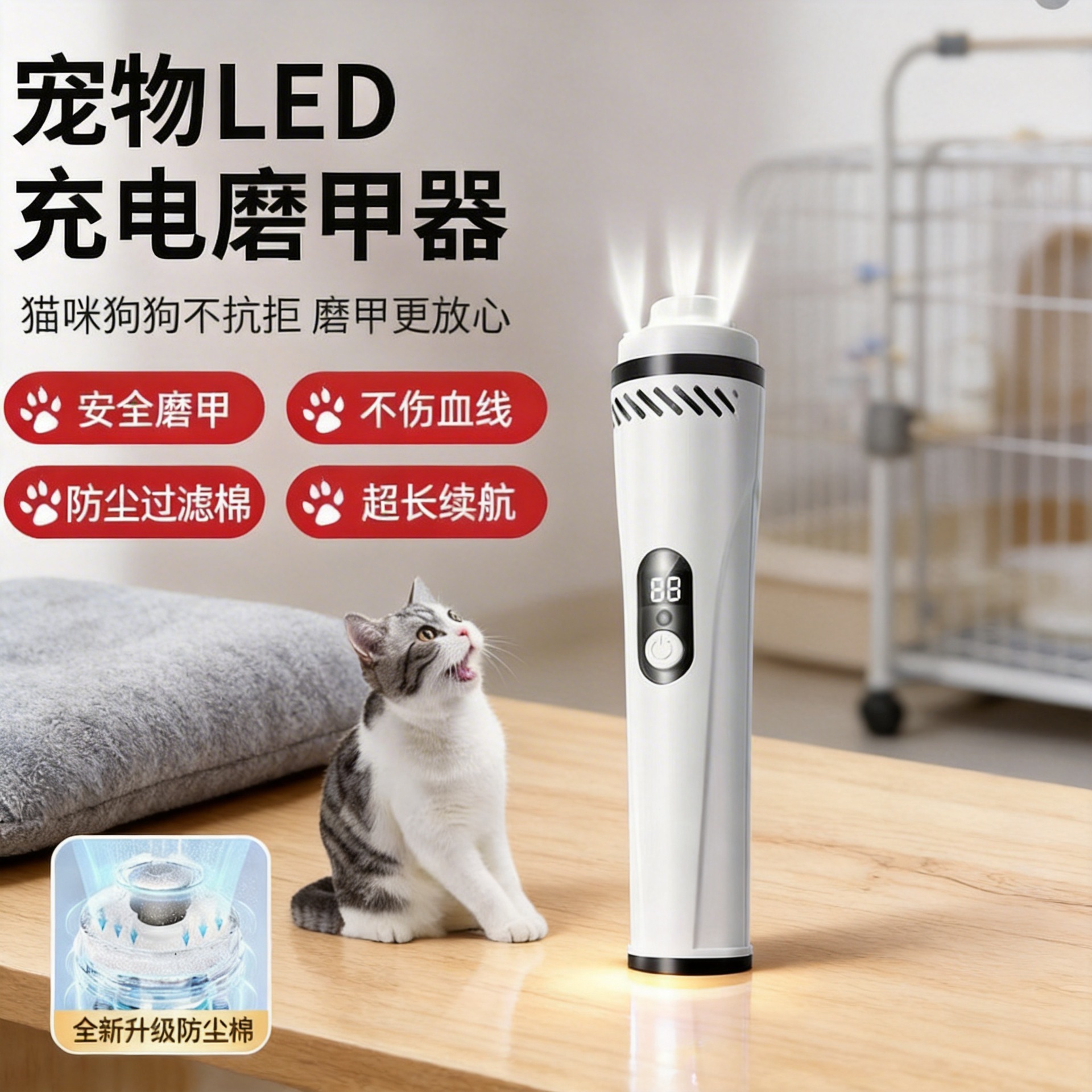 跨境批发宠物猫狗指甲剪USB充电吸尘磨甲器LED灯照明电动修甲器
