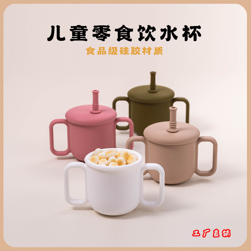 新款食品级硅胶零食杯多功能带盖吸管杯二合一水杯儿童双耳学饮杯