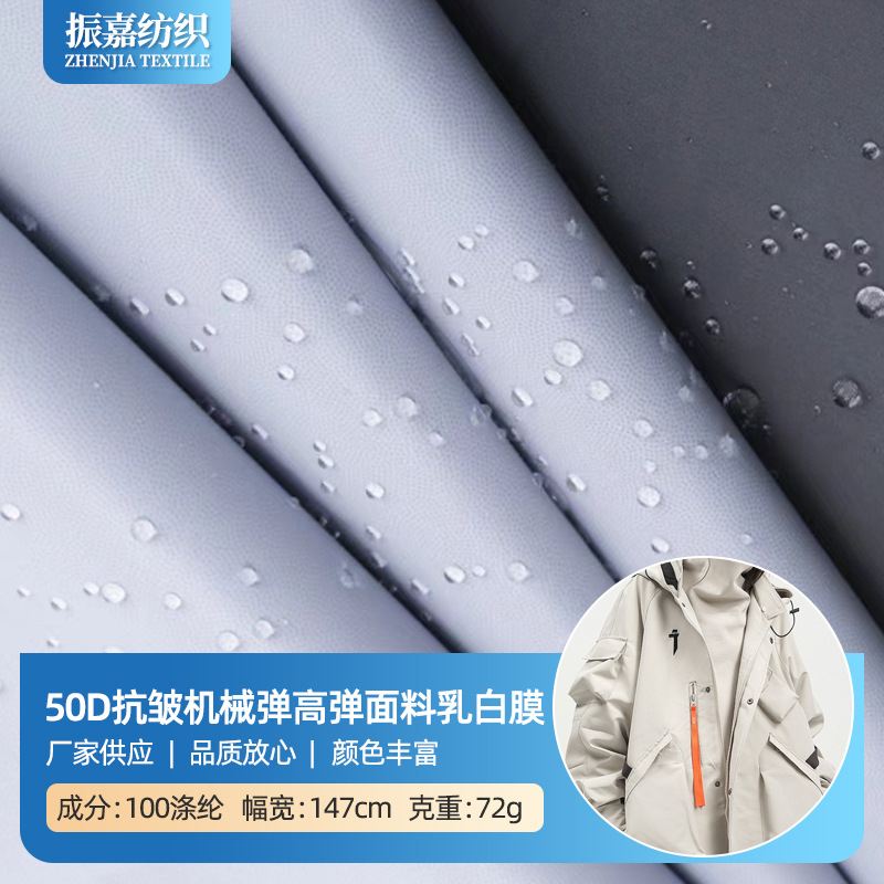 50D高弹春亚纺面料抗皱乳白膜面料防泼水黑色冲锋衣滑雪服一体面