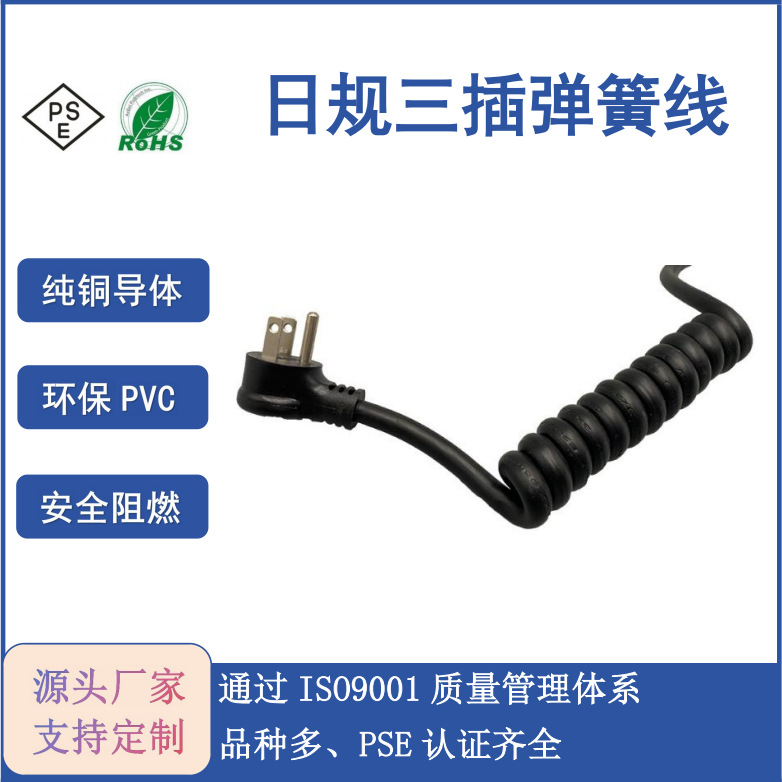 PSE日规3芯纯铜弹簧线 PU/PVC螺旋线 日本家用电器三芯电源线