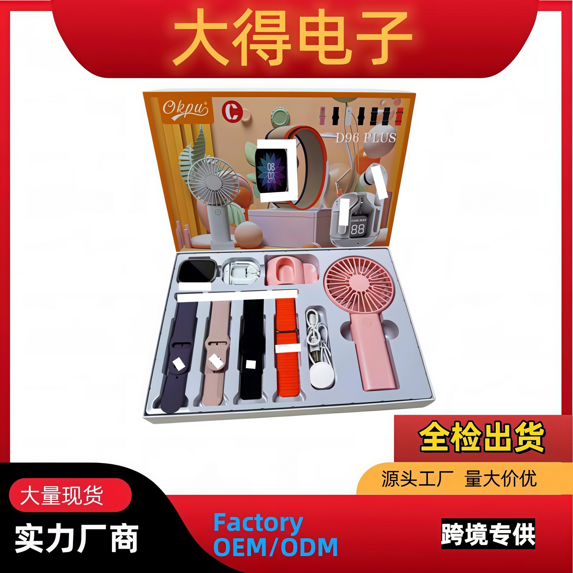 R0CK-0010智能手表套装挂脖耳机+风扇+充电宝+手电筒蓝牙通话手表