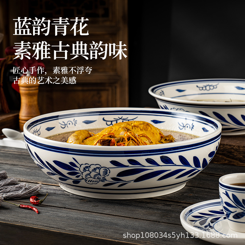 圆形饭店用陶瓷大碗手绘青花瓷汤碗面碗水果沙拉碗复古风餐具