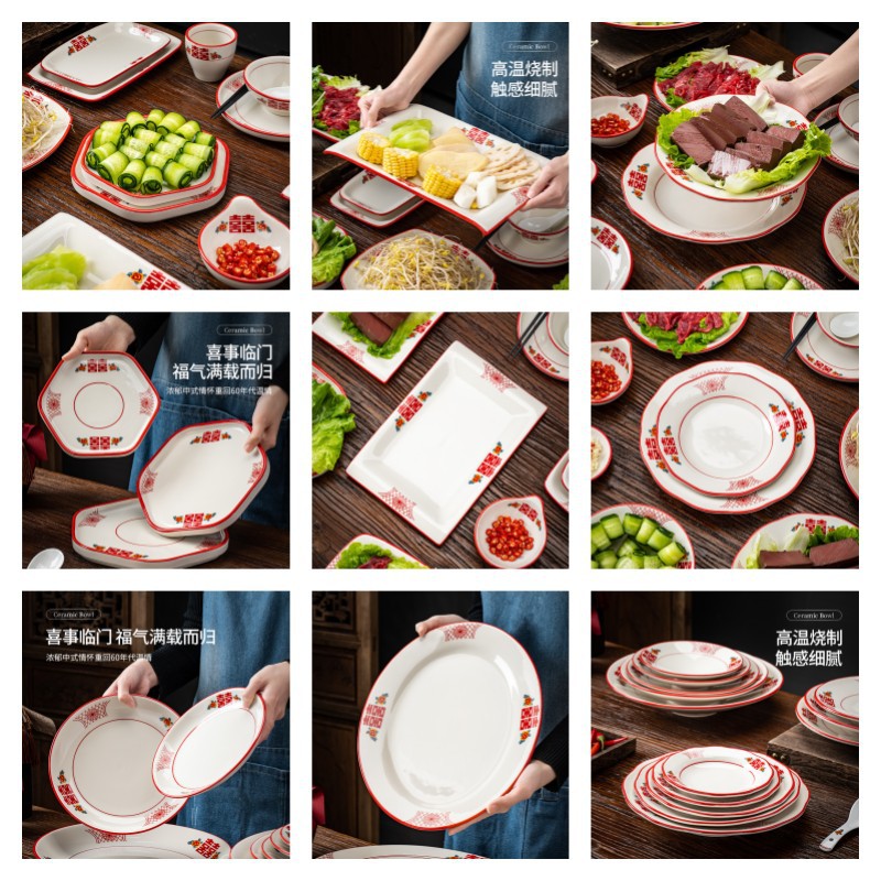 陶瓷复古红双喜盘子火锅菜肉盘子炒菜炒饭盘小吃碟怀旧酒店餐具