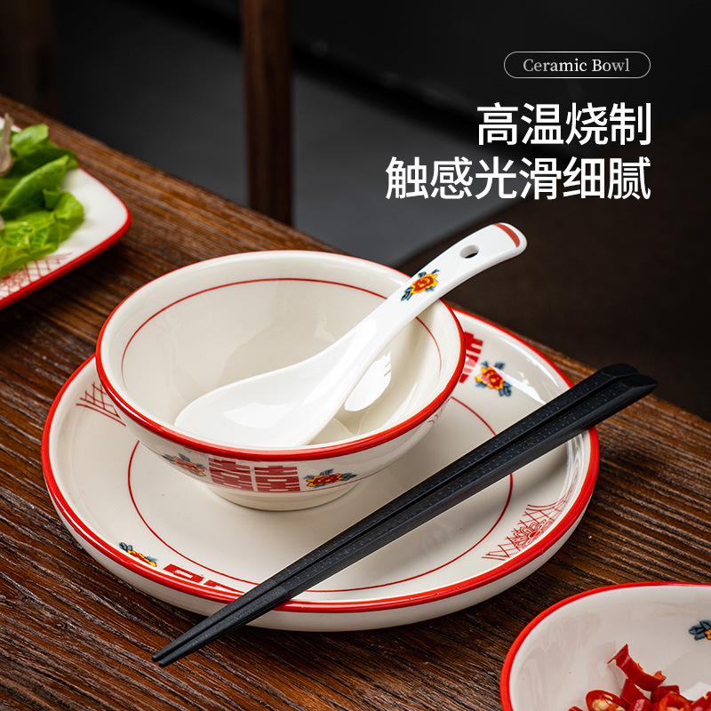 复古红双喜酒店餐厅摆台台面饭碗汤碗茶杯勺子怀旧喜庆陶瓷餐具