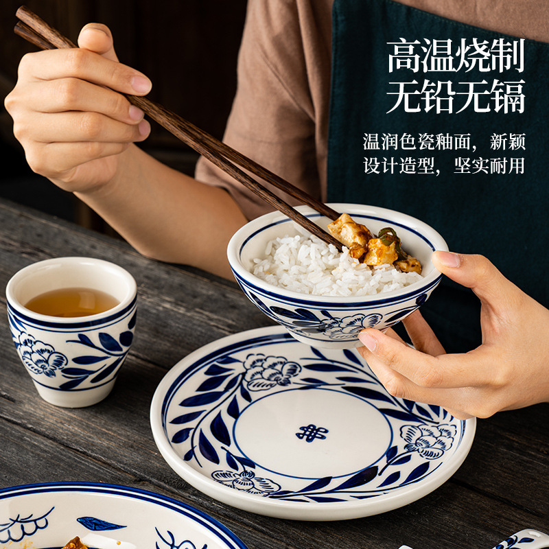 火锅店摆台餐具四件套湘菜馆饭店餐厅复古陶瓷碗碟盘杯套装