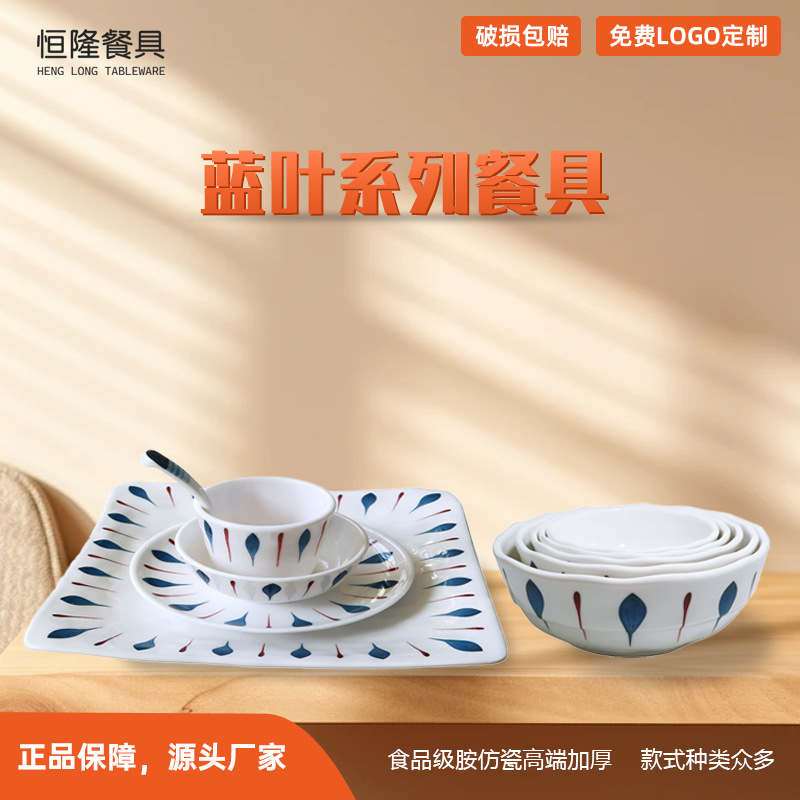 密胺仿瓷日式蓝叶餐馆商用餐具方盘圆盘碗筷仿瓷塑料餐具碗筷碟子