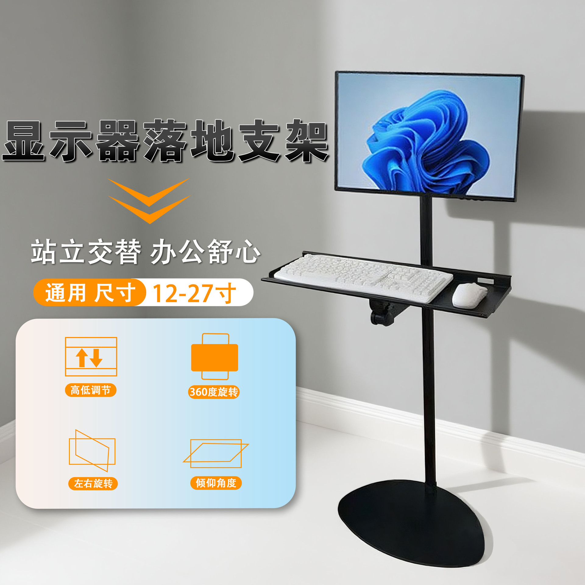 显示器L型落地横竖屏支架14-32寸键盘鼠标托盘站立工作台支架旋转
