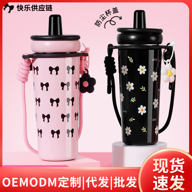 新款大容量车载保温杯高颜值陶瓷内胆杯子学生便携双饮吸管水杯