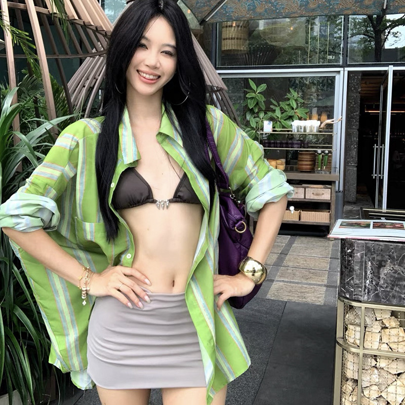 多巴胺风绿色条纹衬衫撞色比基尼女分体裙式小胸三件套度假风温泉