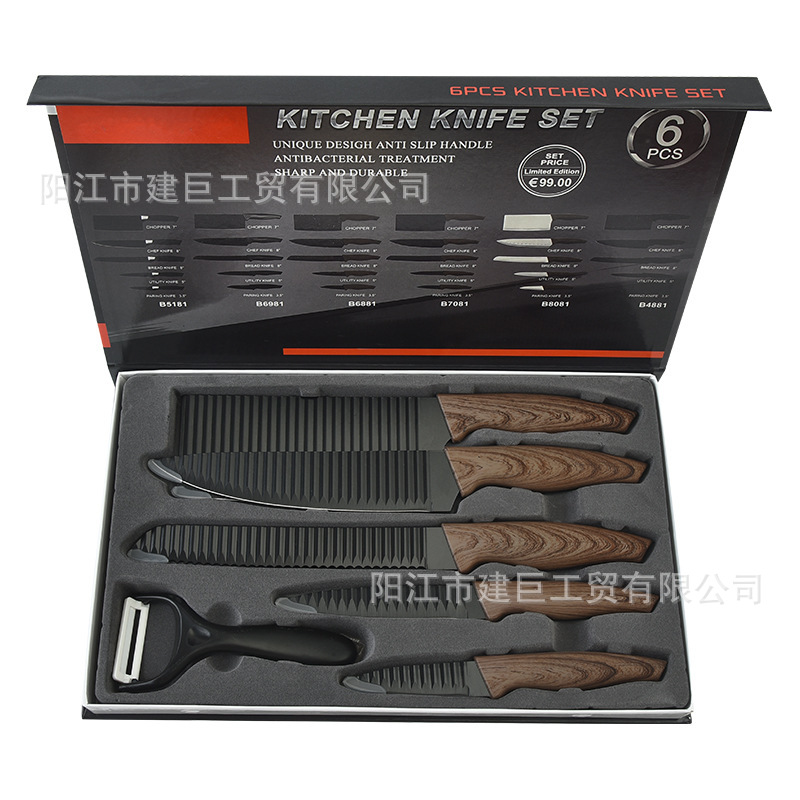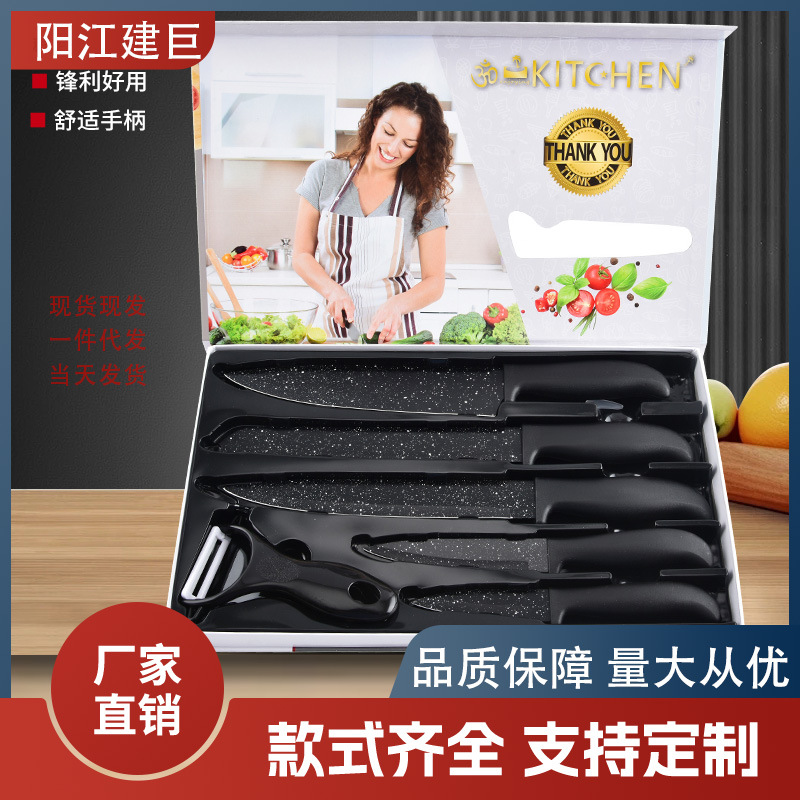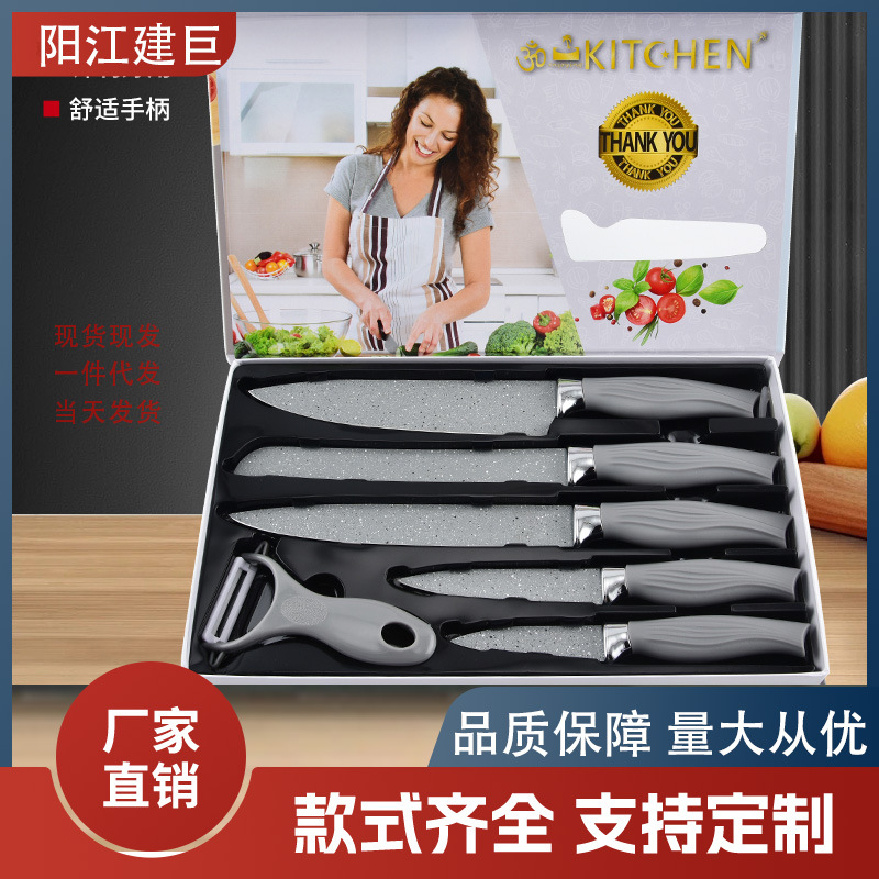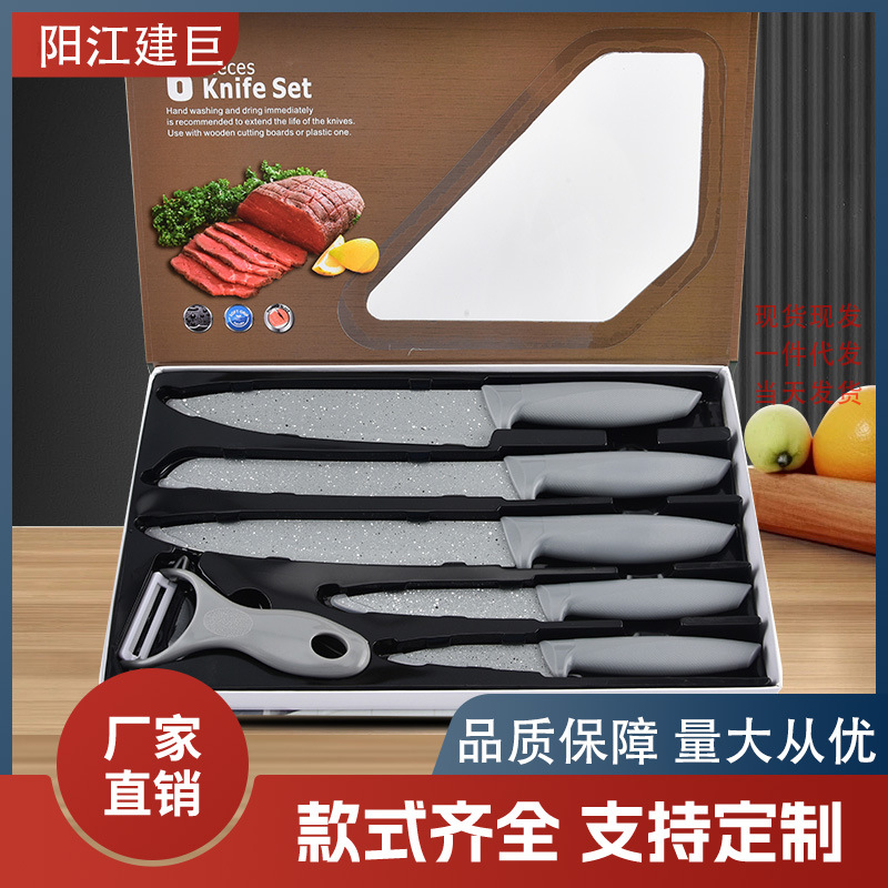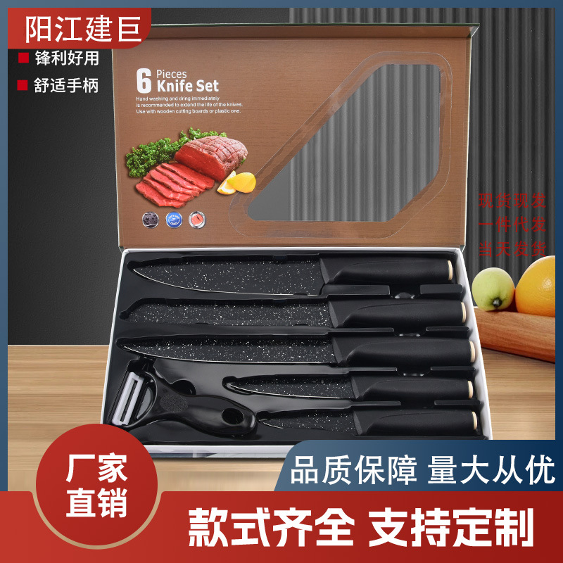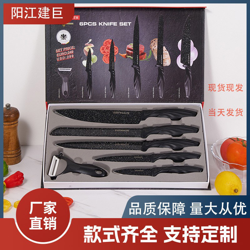 新款现货工厂批发不锈钢喷漆刀肥仔柄墨饭石六件套刀跨境热卖刀具